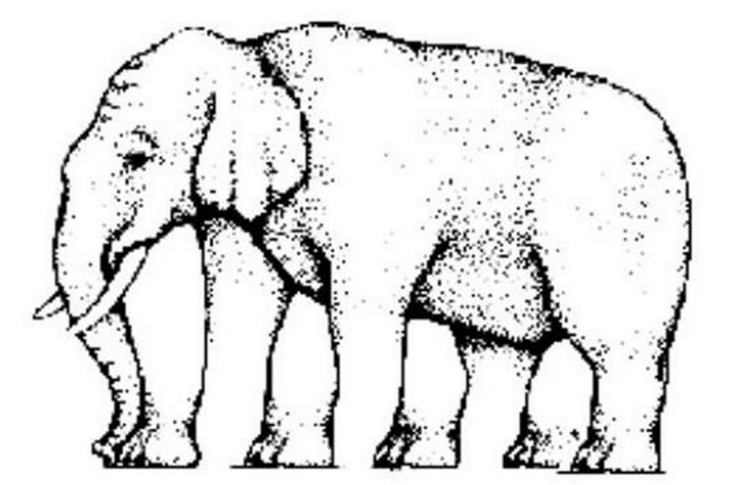 A piece of art creating an elephant from two giraffes.